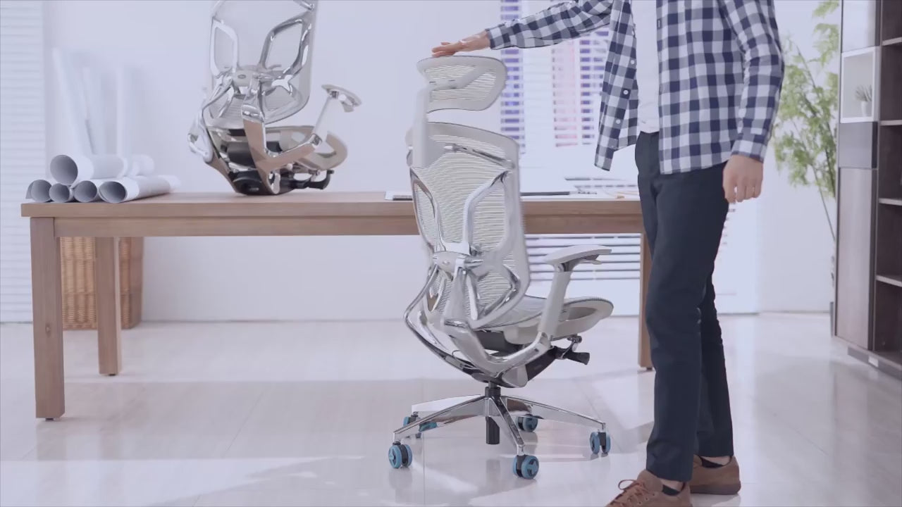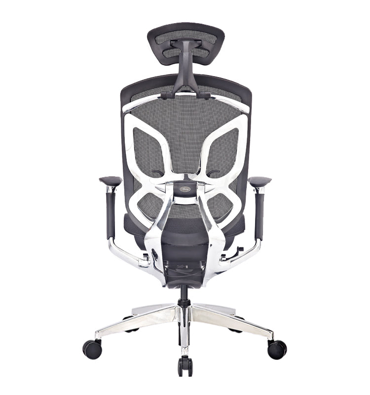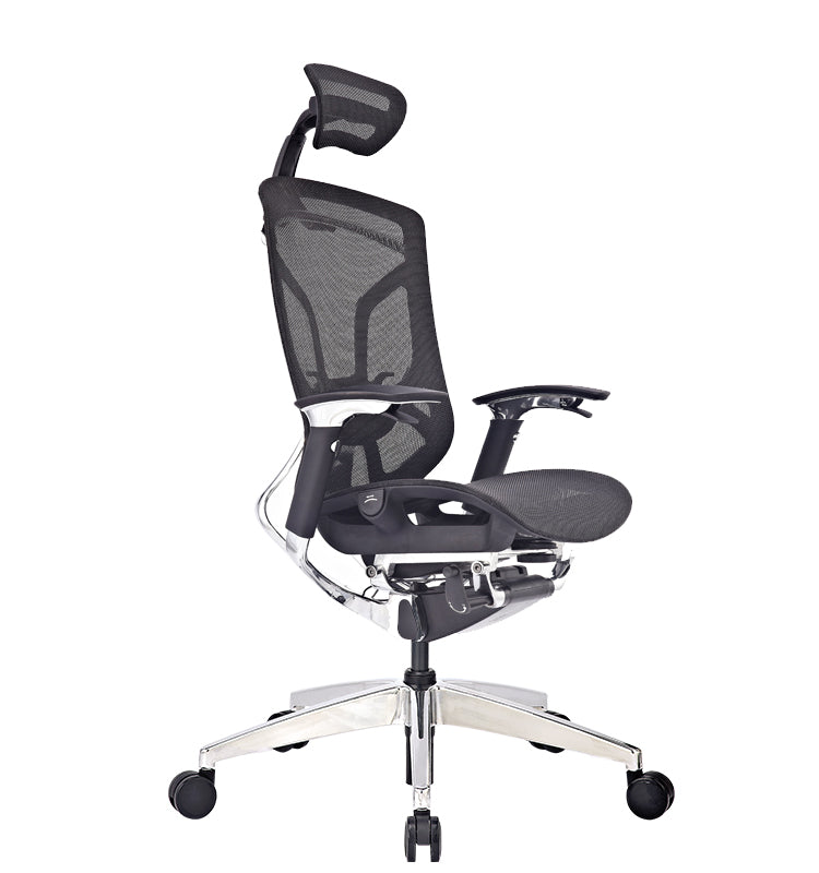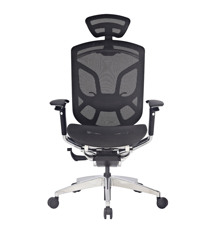 - Cabecera en malla de nylon ajustable en altura, ángulo y profundidad